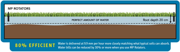 MP Rotator zużywa mniej wody, a jednocześnie - dzięki strumieniowi odpornemu na podmuchy wiatru - zapewnia bardziej równomierne nawodnienie powierzchni niż tradycyjna dysza.