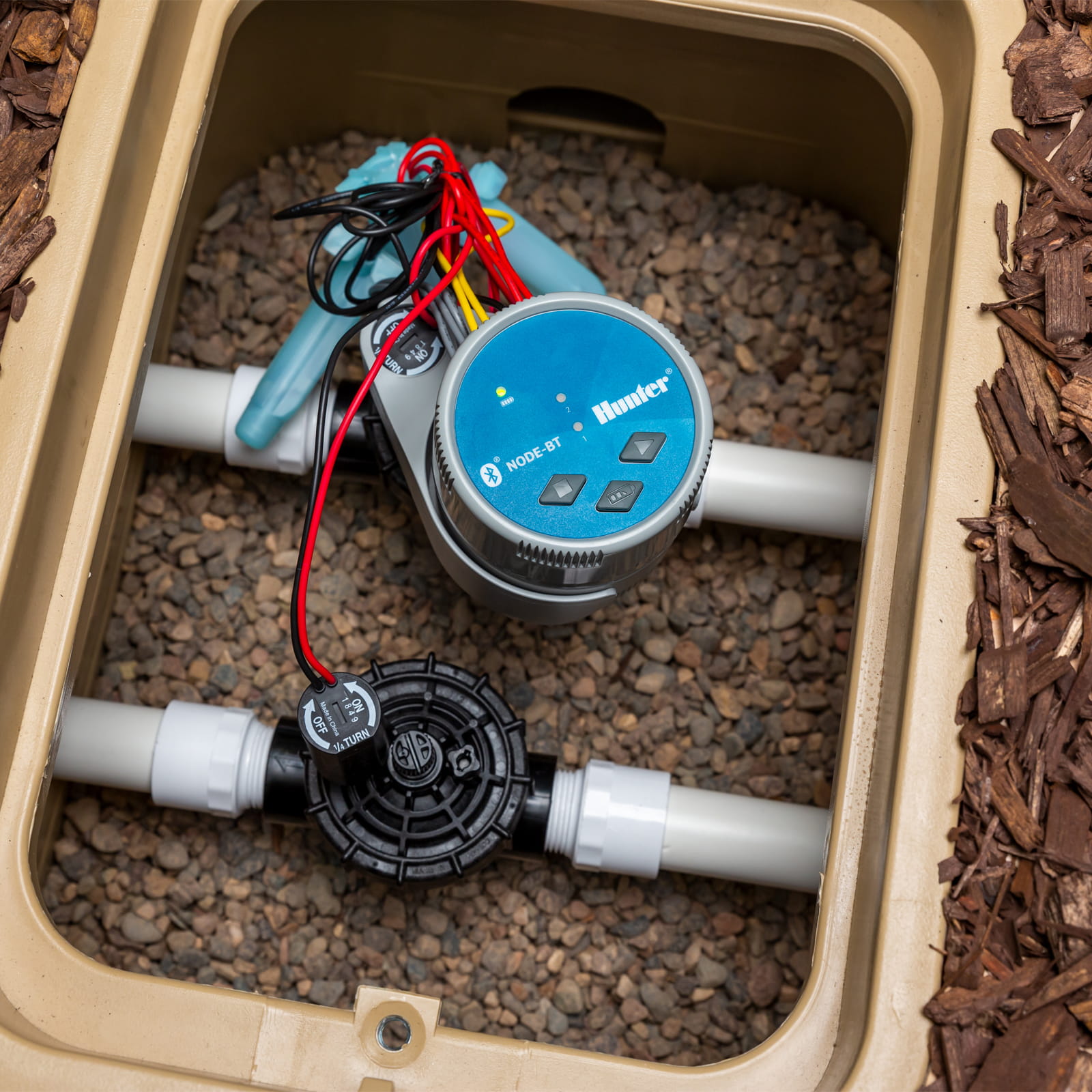 Co najważniejsze, dzięki sterownikom NODE-BT sterowanie nawadnianiem z zasilaniem bateryjnym jest łatwe i wygodne. Sterownik można zamontować na pięć różnych sposobów, co zapewnia wszechstronne możliwości instalacji. Pełne sterowanie z poziomu aplikacji eliminuje konieczność otwierania brudnych skrzynek na zawory i programowania harmonogramów nawadniania na ciemnym ekranie. Osoby obsługujące instalację mogą też włączać nawadnianie i sprawdzać stan baterii, naciskając przycisk na sterowniku, co znacznie przyspiesza konserwację.